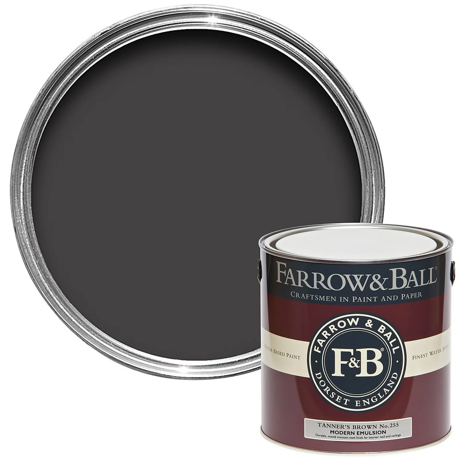 Tanner’s Brown is a strong dark brown that can appear almost black in certain lights. It’s a great alternative to a pure black to create a lower-contrast look, especially in well-lit rooms where its warm red undertones become more apparent.